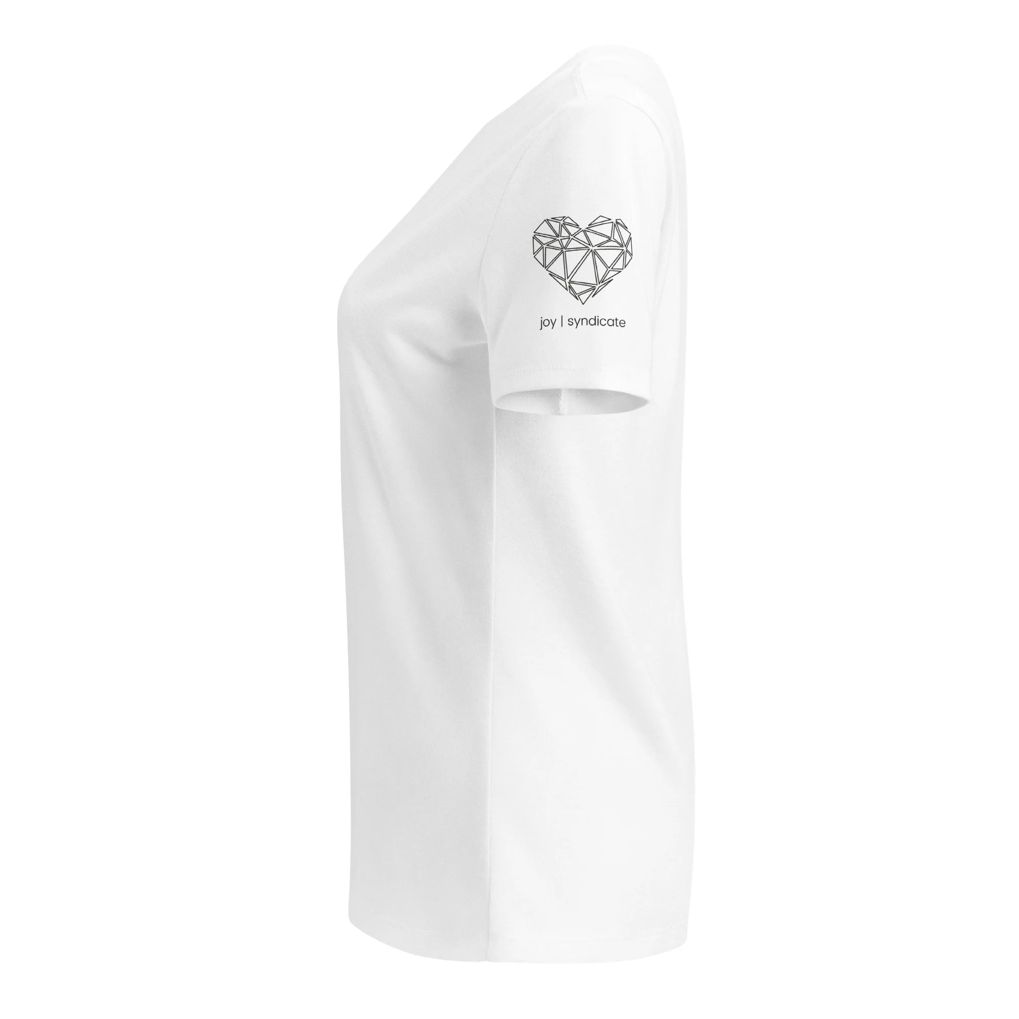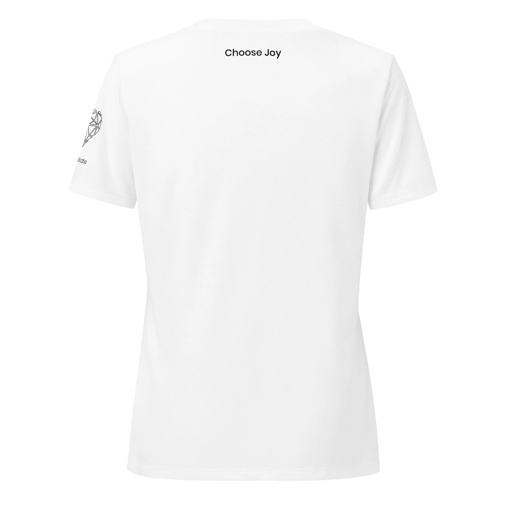 It's on the back. Right where it belongs. "Choose Joy" sits at the nape — small, dark on white, visible only to the people behind you. Not a declaration. More like a quiet note to yourself that happens to be facing outward. The heart mark and wordmark on the sleeve complete it.